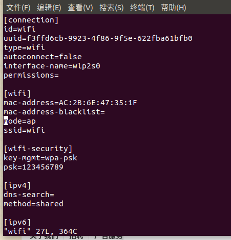 进入创立的新热点文件更改配置,将wifi一项中的mode选项的值改为ap
